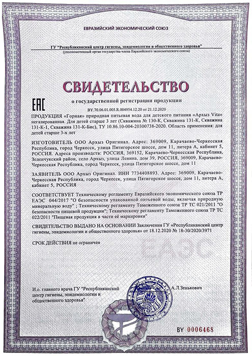 Вода Архыз – является йодированной столовой водой, для которой характерна низкая минерализация. Она рекомендована к ежедневному употреблению многими институтами здоровья, в том числе Институтом Питания РАМН. В частности она признана оптимальной водой для приготовления питания, в том числе детского. Качество поставляемой воды постоянно контролируется: пробы воды берутся два раза в течение часа и направляются в лабораторию для последующего анализа.
