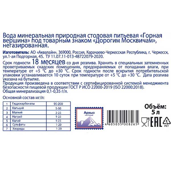 Горная вода «Дорогим Москвичам» содержит 16 важнейших для человека макро- и микроэлементов и при этом имеет естественную низкую минерализацию. Укрепляет иммунитет и широко применяется для профилактики различных заболеваний.