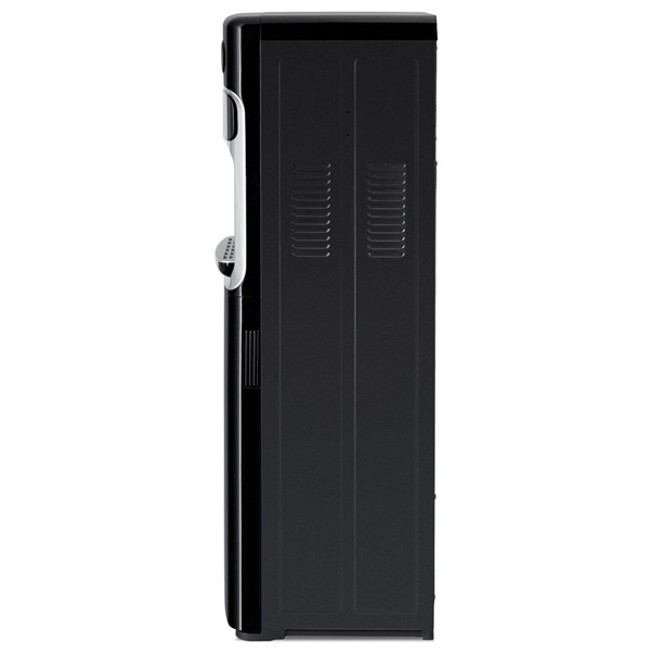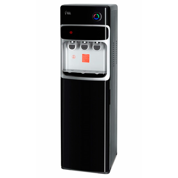 Напольный кулер с нижней загрузкой и электронным охлаждением. Три крана подачи воды типа "нажим кружкой": для подачи горячей воды, холодной и комнатной температуры (из бутыли). Защита на кране горячей воды. Корпус черного цвета с серебристой вставкой в области зоны подачи воды. Светодиодные индикаторы работы, нагрева и охлаждения сгруппированы в один блок круглой формы в верхней части передней панели.