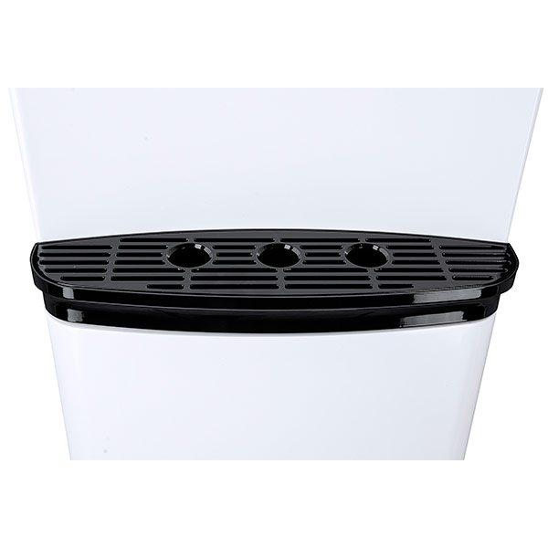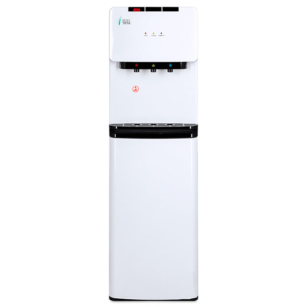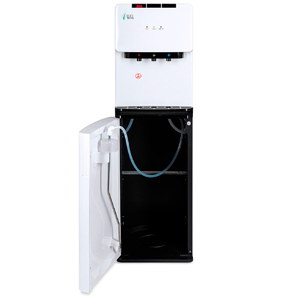 Кулер с нижней загрузкой бутыли и электронным охлаждением. Недорогая, но качественная модель. Три крана подачи воды: горячей, холодной и комнатной температуры. Защита на кране горячей воды. Отсек для бутыли в нижней части корпуса. Светодиодная индикация режимов нагрева и охлаждения воды, а также отсутствия воды в бутыли. Передняя панель белого цвета, с черными акцентными деталями. Остальная часть корпуса черная.