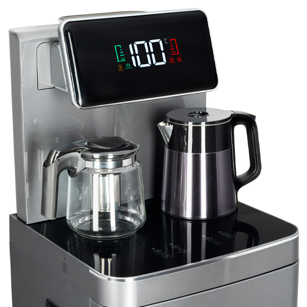 Тиабар Ecotronic TB45-LE graphite — это напольный кулер с чайным столиком с электронным охлаждением. Нижняя загрузка бутыли. Два чайника — для кипячения ( 1 л.) и заварочный ( 1 л.). Нагрев воды в чайнике до 100°С. Шкафчик для хранения.