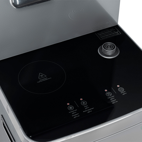 Управление с помощью сенсорной панели управления на русском языке на столешнице. Верхняя часть представляет собой стойку с двумя кранами направленного типа, совмещенную с информационным дисплеем с индикацией работы аппарата.