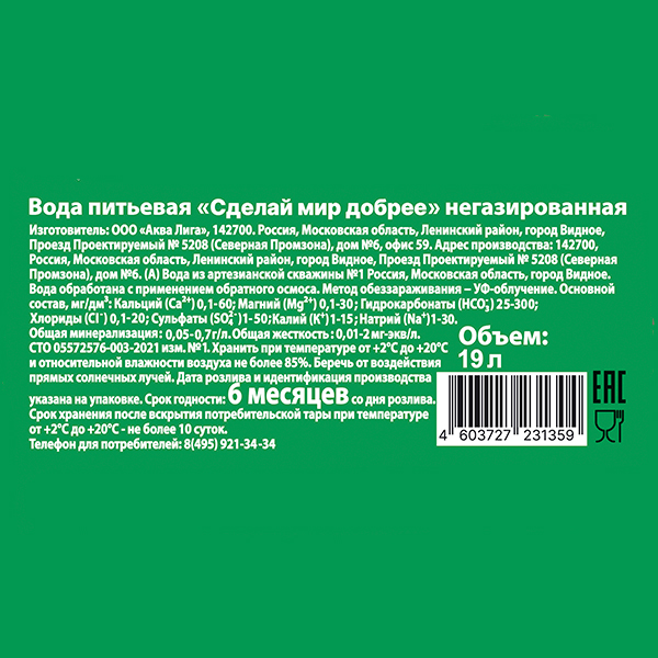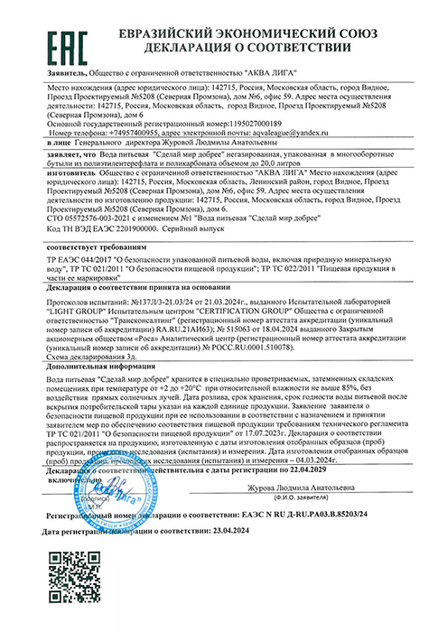 Вода Сделай Мир Добрее сертифицирована государственными органами сертификации. Ее качество соответствует международным стандартам, а сбалансированный состав делает ее идеальной для ежедневного потребления.