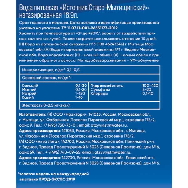 Природная питьевая вода Источник Старо-Мытищинский добывается в экологически чистом районе, из скважины глубиной 110 метров. Очистка и водоподготовка питьевой воды производится на новейшем высокотехнологичном оборудовании "R Bordi". При этом сохраняются все минеральные свойства природной воды.