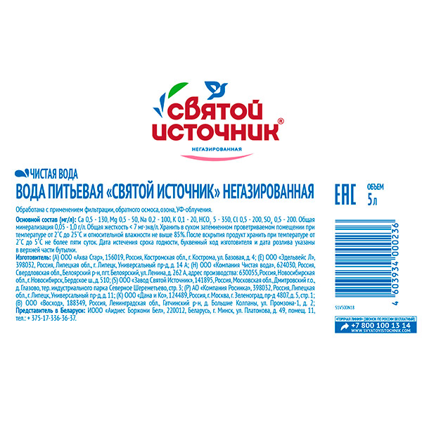 «Святой Источник» – идеальный помощник в поддержании водного баланса и насыщении организма важнейшими макро- и микроэлементами. Производится на основе природной воды из артезианских скважин, расположенных в экологически чистых районах. Поможет поддержать и укрепить здоровье всей семьи.