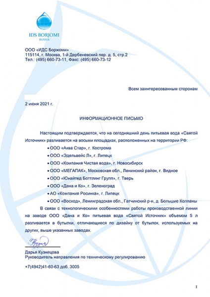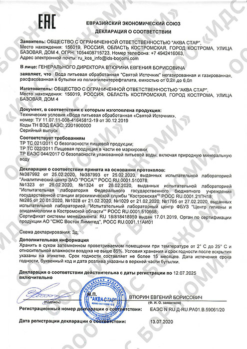 Гарантия качестваПо результатам лабораторных исследований, питьевая вода «Святой Источник» прошла проверку на соответствие требованиям качества и безопасности пищевой продукции.
