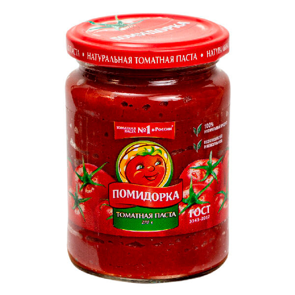 Томатная паста Помидорка – важный компонент первых блюд, соусов, заправок, оригинальных напитков. Она изготовлена из отборных спелых томатов по классической рецептуре, без добавления соли, пряностей и консервантов. Продукт обладает сбалансированным кисло-сладким вкусом, густой однородной консистенцией, насыщенным цветом. Он отличается высоким содержанием витамина С (37,5 мг в 100 г), бета-каротина, тиамина и ликопина, благодаря чему оказывает общеукрепляющее и антиоксидантное действие на организм.