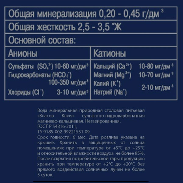 «Власов ключ» – вода с естественной минерализацией, оптимальным балансом компонентов и превосходным вкусом. Она идеально подходит для ежедневного потребления, восстанавливает и поддерживает минеральный баланс организма – ключ к здоровью. Вода не нуждается в серьезной обработке и остается «живой», сохраняя исходные качества и пропорции минералов.