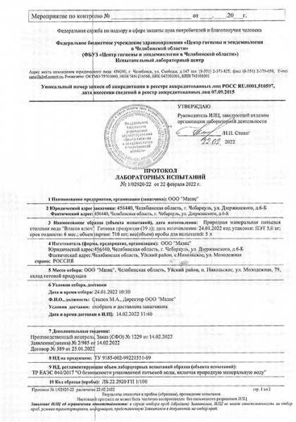 По результатам лабораторных исследований, природная питьевая вода «Власов ключ» прошла проверку на соответствие требованиям качества и безопасности пищевой продукции.