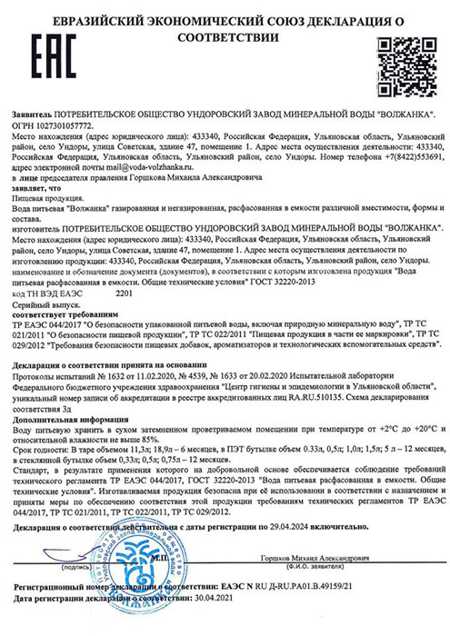 Питьевая вода Волжанка является физиологически полноценной, ее можно употреблять без кипячения и предварительной обработки. Кондиционирование питьевой воды производится минеральной лечебно-столовой водой Волжанка. Питьевая вода Волжанка соответствует высшей категории качества. Невысокая минерализация питьевой воды Волжанка позволяет использовать ее для приготовления напитков и пищи.