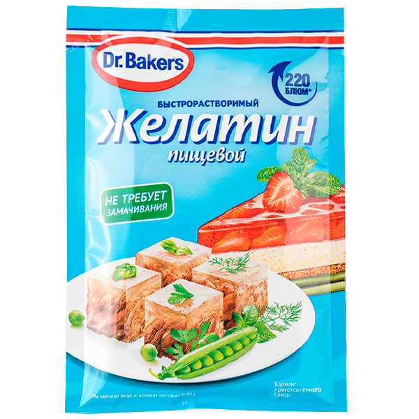 Используется для приготовления холодца, рыбного и мясного заливного, муссов и фруктово-ягодных желе. Рассчитан на 1,5 л воды и отлично подходит для приготовления блюд на большую компанию. Желатин Dr. Oetker не требует длительного замачивания.